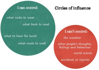 – Then in one circle add all of the things we have no control over, such as the weather, world events, other people’s thoughts, feelings and behaviour, and accidents and injuries